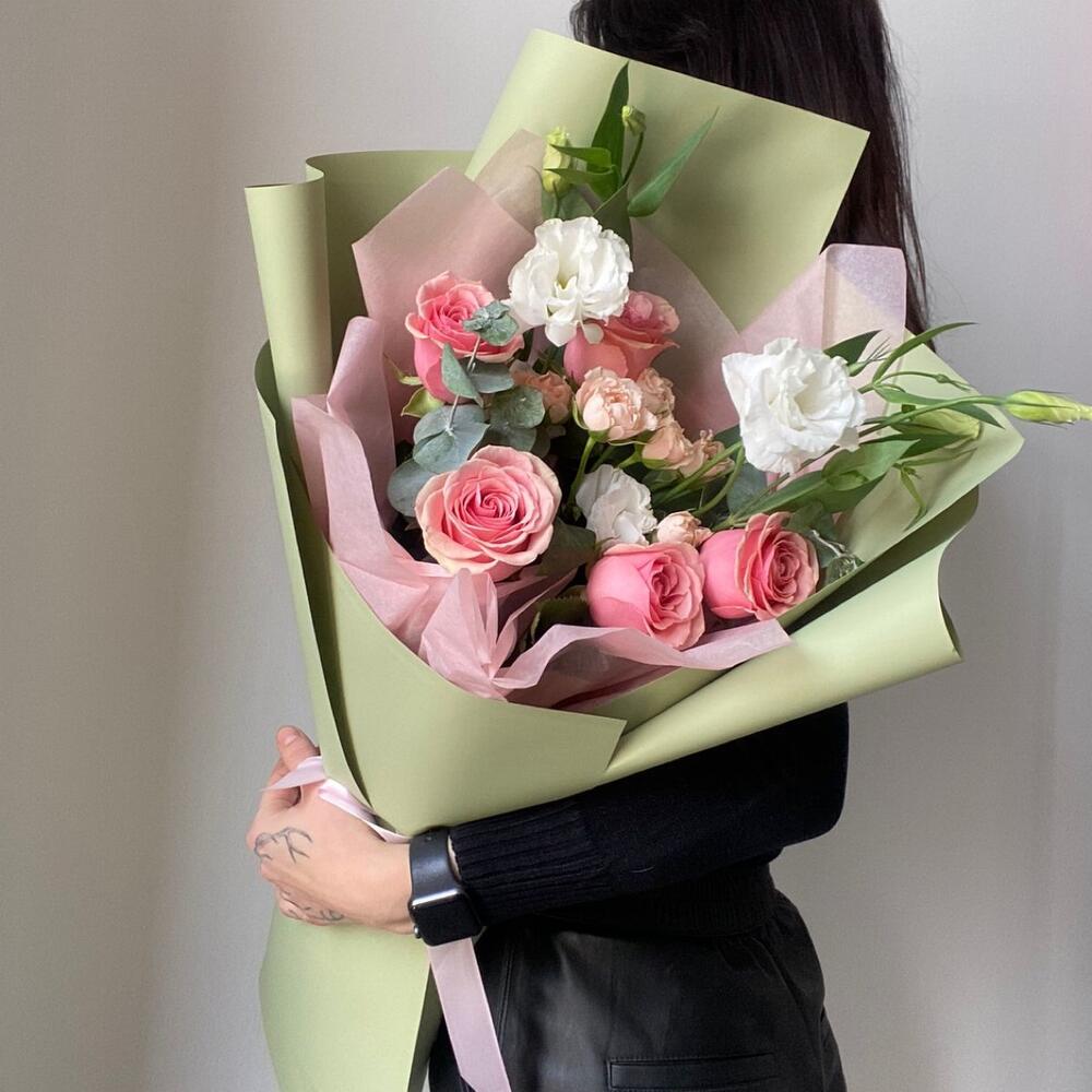 Альстромерии, Гвоздики, Кустовые розы, Лизиантусы, Розы, Хризантемы