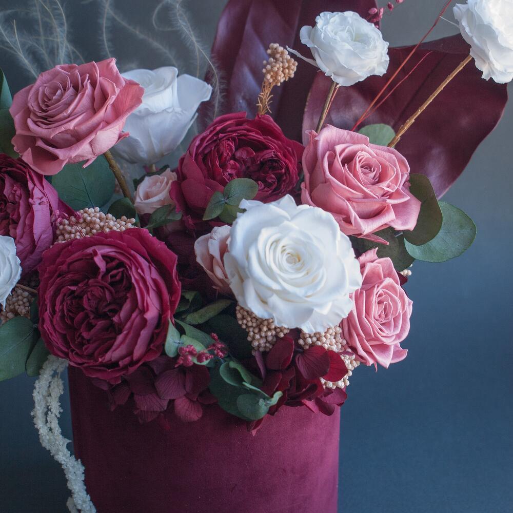 Композиция из стабилизированных цветов в бархатной шляпной коробке